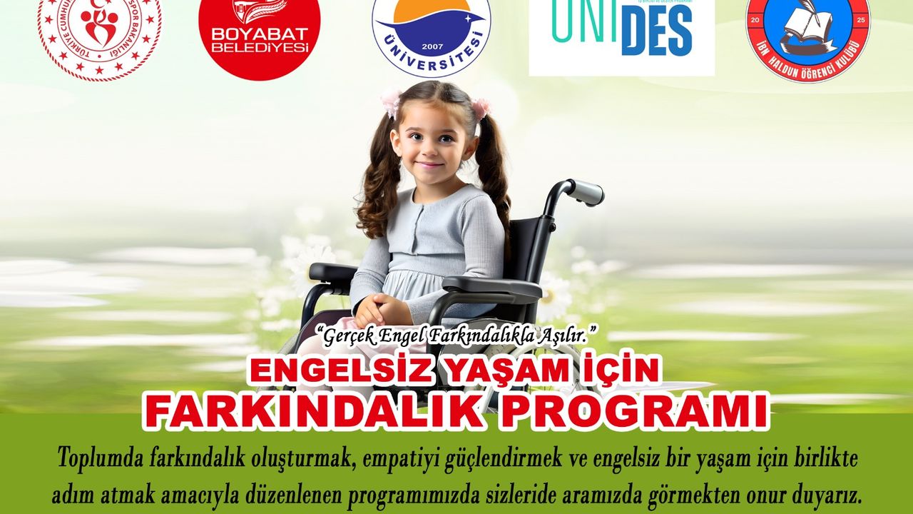 Boyabat Belediyesi, Boyabat Gençlik ve Spor İlçe Müdürlüğü ve Sinop Üniversitesi Boyabat İktisadi ve İdari Bilimler Fakültesi İbn Haldun Öğrenci Kulübü iş birliği ile düzenlenen “Engelsiz Yaşam İçin Farkındalık” Programı’nda, özel bireyler ve ailelerinin sorunları, çözüm yolları konusunda farkındalık oluşturulması hedefleniyor.