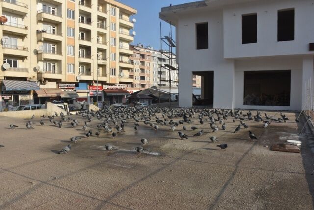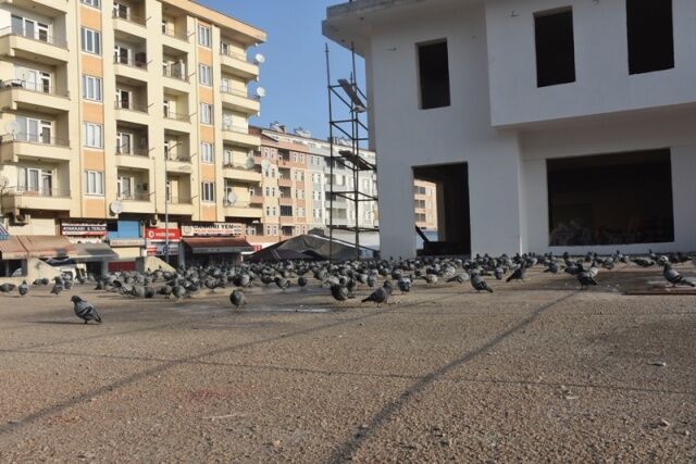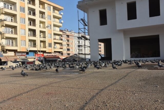 Boyabat'ta yapımı devam eden meydan projesi inşaatını mesken tutan güvercinler güzel bir görüntü oluşturuyor.