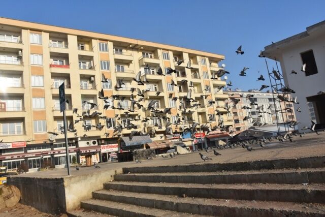 Çevredeki vatandaşların yiyecek verdiği yüzlerce güvercin günün belli saatlerinde çatılardan buraya akın ediyor.